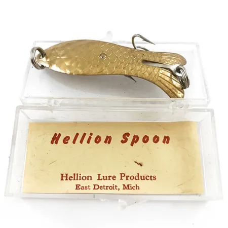 Questa Hellion Fish Crystal, con una superficie dorata stampata con un dettagliato motivo a scaglie, proviene dalla storica azienda Hellion Lure Products di East Detroit, Michigan. Con un peso di 12g (2/5oz) e una lunghezza di 7cm (2 3/4"), l'artificiale presenta un corpo unico a forma di pesce che termina con una coda biforcuta. La finitura Crystal si riferisce alla trama martellata che riflette la luce e ricopre l'esterno in metallo. Questo esemplare è inutilizzato, conservato nella sua confezione originale in plastica trasparente con il cartoncino di fabbrica intatto. Per l'allamata, utilizza un singolo amo posteriore dotato di protezione antialga a filo, fissato tramite un rivetto pesante e un anello spaccato. Catalogato con il codice 11605, l'artificiale mantiene i bordi affilati e la finitura lucida tipica degli attrezzi della metà del secolo scorso. Il lato inferiore rivela il marchio del produttore, segno dell'autentico patrimonio alieutico del Michigan.