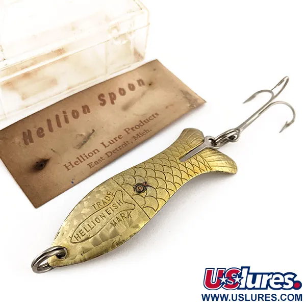 Punzonato con il marchio "TRADE HELLION FISH MARK" direttamente sul metallo, questo ondulante prodotto nel Michigan rappresenta l'era classica dei Hellion Lure Products di East Detroit. Lungo 7 cm (2 3/4"), il corpo ottonato presenta un motivo a scaglie profondamente inciso e una distinta silhouette a forma di pesce. Questo esemplare mai usato, classificato con condizione 6, si conserva in uno stato notevole e viene fornito con la sua custodia espositiva originale in plastica trasparente e l'inserto in cartone "Hellion Spoon". Con un peso di 12 g (2/5 oz), l'esca è dotata di un robusto anellino spaccato in testa e di un'ancoretta singola nella sezione di coda. Etichettata con il codice prodotto 11770 e la denominazione di colore "Crystal", la finitura metallica è brillante e pulita. La confezione originale identifica l'origine da East Detroit, Mich., preservando la storia di un produttore regionale americano di attrezzatura da pesca.