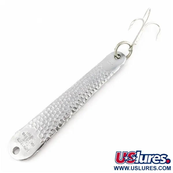 Con un peso di 42 g (1 1/2 oz), questo robusto ondulante in nichel è concepito per le grandi profondità e per un utilizzo gravoso in mare. Lungo 10 cm (4"), il corpo è caratterizzato da una particolare finitura martellata per creare bagliori di luce, che passa a una sezione liscia stampata alla base. Questo specifico esemplare, identificato dal codice 24356, rappresenta il periodo in cui l'azienda americana Herter's Inc. importava articoli da pesca di alta qualità dal Giappone per i suoi iconici cataloghi. La denominazione Cape Hatteras richiama le difficili acque costiere del North Carolina, sottolineando un design nato per insidiare i grandi predatori. La nichelatura è eccezionalmente conservata, con una valutazione di 5/5; l'incisione "Herter's Cape Hatteras Japan" è nitida e profonda. È equipaggiato con un resistente anellino a spacco e un'ancoretta lucente in coda, mentre la testa presenta un foro ben rifinito per il collegamento della lenza.