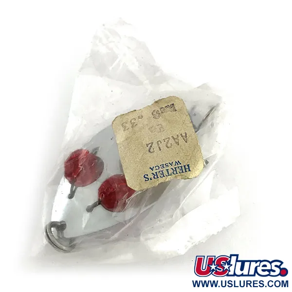 Gli occhi in vetro rosso sono incastonati direttamente nel corpo nichelato di questo cucchiaino Herter's Glass eye spoon, una caratteristica distintiva del design del secondo dopoguerra. Queste esche venivano prodotte nel Giappone occupato per l'iconico marchio outdoor americano, collegando la produzione globale alle sue radici a Waseca, Minnesota. Con un peso di 11 g (2/5 oz) e una lunghezza di 5,5 cm (2 1/4"), il cucchiaino offre un profilo consistente per lo spinning o la traina in acqua dolce. Il lato posteriore presenta il nome e la sede del produttore stampati nel metallo. Questo esemplare specifico è inutilizzato, ancora custodito nel suo sacchetto di plastica trasparente originale con il cartellino di carta vintage contrassegnato AA2J2 e un prezzo originale di 33 centesimi. La finitura al nichel rimane lucida e i due inserti degli occhi in vetro rosso sono saldamente in sede. Con il codice prodotto 8987, l'esca include un anellino spaccato in testa per il collegamento diretto al finale o alla girella.