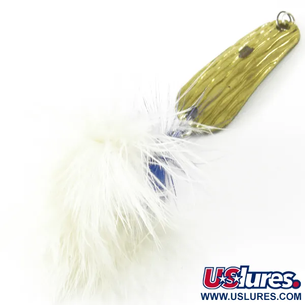 Una placcatura in oro riveste la superficie testurizzata di questo ondulante da 8 g (1/4 oz), progettato per catturare la luce da ogni angolazione. Con una lunghezza di 4 cm (1 1/2"), il corpo presenta una trama ondulata profonda sul lato anteriore, mentre il retro rimane liscio. Questo retro liscio mostra chiaramente i marchi 'HERTER'S HUDSON BAY SPOON' e 'JAPAN', segni distintivi della produzione del marchio durante il periodo di fabbricazione giapponese. Collegata tramite un anellino spaccato in metallo, l'ancoretta è vestita con una combinazione di piume bianche e viola, creando un profilo morbido e voluminoso. I componenti metallici e la finitura mostrano un'usura minima della superficie, con una valutazione delle condizioni di 4/5. Per scopi di documentazione, questo esemplare è identificato dal codice prodotto 3427. Il contrasto tra il metallo dorato lucido e le piume viola offre un profilo visivo distintivo, spesso preferito per il lancio in acque chiare.