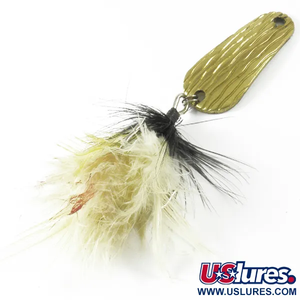 Con un peso di 1/4 di oncia (8 g), le proporzioni classiche di questo ondulante riflettono la filosofia di design pratico che ha reso il catalogo di George Leonard Herter un punto di riferimento per i pescatori della metà del secolo. La placcatura in oro presenta una trama ondulata e martellata sul lato convesso, mentre la superficie interna è lucidata e riporta l'incisione distintiva "HERTER’S HUDSON BAY SPOON". Con una lunghezza di 1 1/2" (4 cm), l'esca è rifinita con un amo triplo piumato, che combina fibre bianche e nere per allungare il profilo dell'esca. Questo specifico esemplare, identificato dal codice prodotto 3493, è stato prodotto in Giappone in un'epoca in cui Herter’s importava componenti robusti dall'estero per soddisfare le esigenze dei pescatori americani. Il metallo mostra lievi segni di usura dovuti al tempo, meritando una valutazione di conservazione di 4/5, pur rimanendo un reperto storico pulito e funzionale. Il lancio di questo ondulante leggero era una tecnica standard per la trota e il panfish, basata sul riflesso della finitura dorata e sulla sottile vitalità dell'amo piumato.