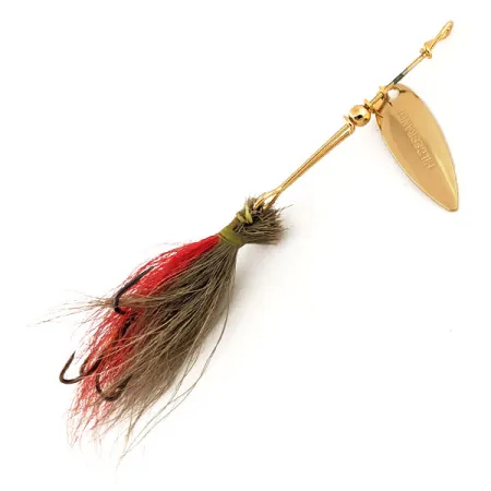 Il leggendario nome Hildebrandt è chiaramente stampato sulla pala dorata a foglia di salice, identificando questo preciso cucchiaino rotante ultraleggero da 1,2 g (3/64 oz). L'armatura metallica è lucida e dritta, caratterizzata da una piccola perla dorata che funge da cuscinetto fluido per l'attacco della pala. Un mix di piume naturali marroni e rosse è legato a mano sull'ancoretta, fornendo quel profilo visivo sottile tipico delle esche vintage da trota e persico. Identificato con il codice prodotto 12549, questo esemplare esemplifica gli elevati standard di placcatura e assemblaggio del marchio. La finitura dorata dell'asse e dei componenti è eccezionalmente ben conservata. L'esca è inusata, senza alcun segno di usura sulle punte degli ami o ossidazione sulle superfici metalliche.