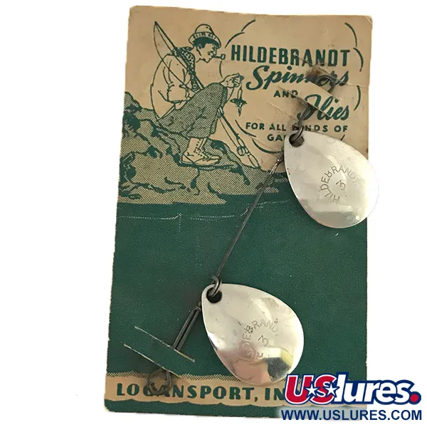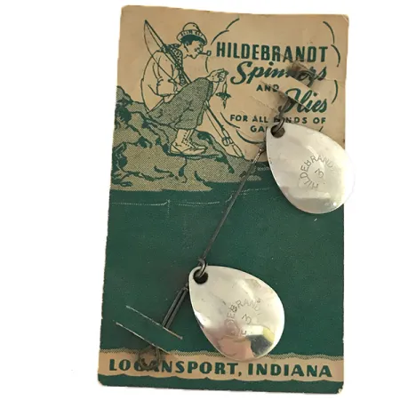Palette a goccia nichelate, stampate con l'iconico marchio «HILDEBRANDT 3», mettono in risalto la maestria funzionale di questo accessorio d'epoca. Con un peso di 3/32oz (3g), questa configurazione a doppio spinner rimane montata sulla sua scheda di vendita illustrata originale, che riporta l'origine a Logansport, Indiana. Il retro della confezione identifica questo modello come un «genuino No. C1» HILDEBRANDT SPINNER (No. C Idaho Spinner), specificamente progettato per essere pescato insieme alle mosche tradizionali per tutti i pesci sportivi. Catalogato con il codice prodotto 8519, l'esemplare presenta due palette brillanti su un'asta metallica pulita. La finitura dei componenti metallici è stata eccezionalmente ben conservata, riflettendo la luce proprio come faceva decenni fa negli USA. Questo modello mette in mostra l'approccio dell'inizio del XX secolo alle esche multi-paletta, utilizzando semplici connessioni meccaniche per consentire alle palette di ruotare liberamente attorno all'asse centrale. L'esemplare è in condizioni 5/5, mantenendo la sua lucentezza originale e l'integrità strutturale, mentre il cartoncino funge da documento storico per le radici del marchio nel Midwest.