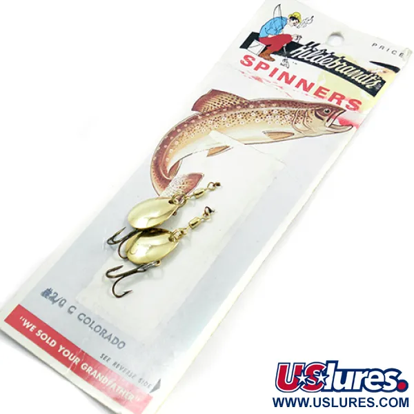 La placcatura in oro cattura la luce su queste due piccole palette in stile Colorado, ancora fissate sulla loro scheda originale di fabbrica Hildebrandt. Con un peso di 1,4 g (3/64 oz) ciascuno, questi cucchiaini rappresentano il classico design americano che l'azienda pubblicizzò con il celebre slogan "We Sold Your Grandfather". Le palette sono stampate con il nome Hildebrandt e la misura, garantendo l'autenticità per ogni collezionista di attrezzatura vintage. Ad ogni paletta dorata è collegata una piccola e affilata ancoretta, fissata con componenti di qualità per applicazioni light-game su trote o persici. Identificato dal codice prodotto 1882, questo set specifico rimane inutilizzato nella sua confezione originale, sebbene il cartoncino mostri alcuni segni del tempo. Prodotti negli USA, le girelle in ottone e gli anellini brisati rimangono solidi e funzionali. La forma a goccia della paletta Colorado è un design tradizionale utilizzato per fornire sollevamento durante il recupero lento in corrente o in acque ferme.