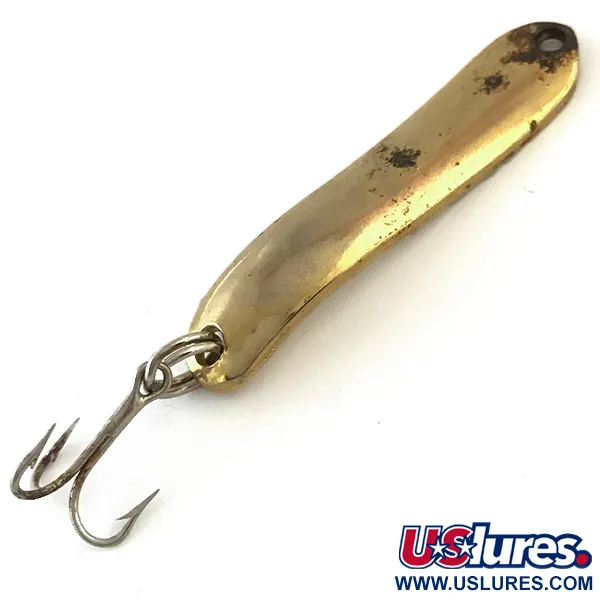 Splendente di una classica finitura dorata, questo ondulante Acme Hippy pesa 4g (1/8oz) ed è un pezzo storico dell'attrezzatura americana. Il corpo in metallo misura 4cm (1 1/2") di lunghezza, con il nome 'HIPPY' stampato in profondità sulla superficie curva. Come esemplare del codice 5420, riflette il design utilitaristico per cui Acme è nota negli USA. Lo stato di conservazione è 3/5, con alcune macchie scure e una leggera usura superficiale della placcatura in oro che testimoniano la sua età senza compromettere l'integrità del metallo. È armato con un robusto anello spaccato e un'ancoretta standard, con la testa forata per l'attacco diretto del filo o di una girella.