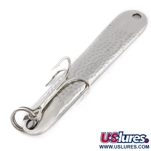 La placcatura in nichel martellato caratterizza la superficie di questa esca in metallo da 60g (2 oz), un design nato nel 1949 dalla ricerca di R.L. Hopkins per uno strumento da lancio in mare estremamente resistente. Con una lunghezza di 10,5 cm (4 1/4"), l'Hopkins No=Eql 3 è progettato con un profilo compatto studiato per raggiungere rapidamente le profondità. Il corpo presenta la chiara stampigliatura 'HOPKINS NO-EQL @ 3 1/2' sulla faccia martellata, che aiuta a disperdere i riflessi luminosi. Sia l'ancoretta che il robusto split ring si presentano in condizioni 5/5, con un aspetto lucido e pulito. Catalogata con il codice prodotto 22591, questa esca utilizza un attacco a foro singolo sulla punta affusolata. La sua costruzione è focalizzata principalmente su applicazioni di casting e jigging, dove il peso e la resistenza alla corrosione sono prioritari.