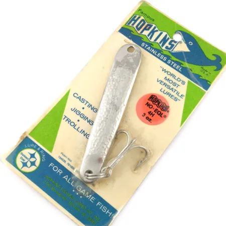 Con una lunghezza di esattamente 11,5 cm (4 1/2"), questo cucchiaino vintage riflette la luce grazie alla sua inconfondibile finitura in nichel martellato. Questo Hopkins No=Eql 4, identificato dal codice prodotto 21155, è conservato nella sua confezione originale ed è rimasto inutilizzato. Per i collezionisti di attrezzatura americana, la costruzione in solido acciaio inossidabile è un segno distintivo della robustezza del marchio, fin da quando R. L. Hopkins iniziò la sua attività nel 1949. Con un peso di 65 g (2 1/4 oz), la densità compatta dell'esca è studiata appositamente per il jigging in acque profonde o per raggiungere banchi di pesci lontani pescando dalla barca o dal molo. La componentistica consiste in un robusto anellino spaccato e un'ancoretta rinforzata, progettati per resistere alla trazione di pesci da trofeo. La confezione originale blu e verde lo definisce come una delle "esche più versatili al mondo", indicata per tecniche come jigging, spinning e traina. Un'etichetta arancione "4H" sulla confezione fornisce un riferimento visivo immediato per questo specifico modello all'interno della serie.
