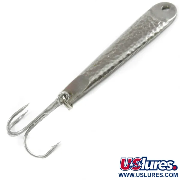 Punzonato chiaramente nel corpo metallico, il marchio "HOPKINS NO=EQL 2" identifica questo jig da 6,5 cm (2 1/2") come un autentico pezzo di storia della pesca americana. Il modello 3270 è caratterizzato da una particolare finitura in nickel martellato, progettata per catturare e riflettere la luce attraverso la colonna d'acqua. Con un peso di 14 g (1/2 oz), la densa struttura in metallo massiccio facilita lanci a lunga distanza o un jigging verticale preciso. Questo esemplare è in condizioni 5/5, mostrando una superficie brillante e pulita che sottolinea l'artigianalità della sua origine USA. All'estremità affusolata, un robusto anello spaccato assicura un'ancoretta affilata, mentre un singolo occhiello sulla testa funge da punto di attacco per moschettone o lenza.
