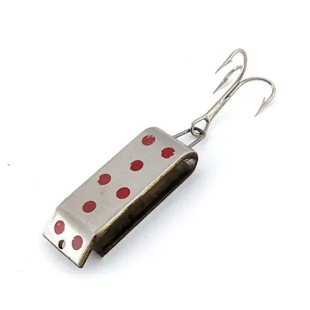 Sette punti rossi vivaci sono stampati sulla superficie in nichel lucidato di questo Jake's Lures Lil Jake, identificato dal codice prodotto 14705. Con una lunghezza di 3,5 cm (1 1/2"), questo esemplare prodotto negli USA presenta una particolare struttura in metallo ripiegato che lo distingue dai classici cucchiaini piatti. L'esca pesa 9g (1/3oz), offrendo un peso considerevole per le sue dimensioni, ideale per raggiungere le profondità desiderate durante il lancio o la traina. Si presenta in condizioni 5/5, mostrando un corpo riflettente molto pulito e una vernice rossa ben conservata. Questo design è studiato per una doppia azione, combinando un movimento oscillante con il bagliore di un rotante per attirare trote e salmoni in acque limpide. Una robusta ancoretta è montata sulla parte posteriore, mentre la punta fornisce un punto di attacco semplice e diretto per la lenza.