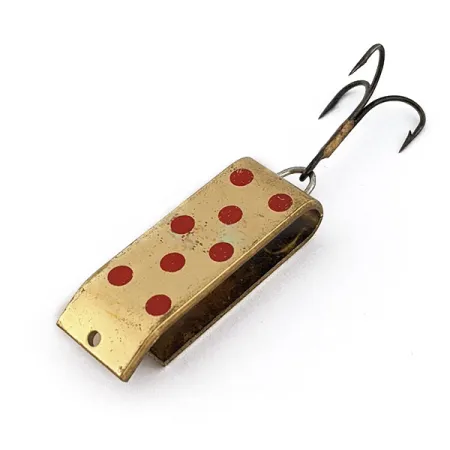 Pois rossi punteggiano la classica finitura dorata di questa esca metallica vintage da 3,5 cm. Identificato dal codice prodotto 18180, questo esemplare si distingue per il particolare design a piastra ripiegata, che unisce le caratteristiche di un cucchiaino ondulante e di un rotante. Con un peso di 9 g, il Lil Jake è bilanciato per lanci precisi in fiumi o laghi. Prodotta nel Wyoming, USA, questa esca mostra segni di un uso attento, con una valutazione delle condizioni pari a 4/5. La placcatura dorata conserva una brillante lucentezza sul corpo rettangolare, che termina con una piega netta vicino all'attacco del filo. Un'ancoretta brunita è assicurata da un robusto split ring in coda, a testimonianza della solidità costruttiva tipica della prima produzione di Jake's Lures.