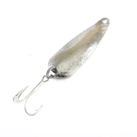Chiaramente punzonata con il marchio 'JEEP' sulla sua superficie concava interna, questo ondulante in metallo è un classico esempio di attrezzatura americana della metà del secolo scorso. Con un peso di 11 g (2/5 oz) e una lunghezza di 5,5 cm (2 1/4"), l'esca presenta una distintiva finitura in nichel martellato sulla faccia convessa per fornire un riflesso sfaccettato. Il lato interno è liscio, mettendo in evidenza il logo stampato e la sua origine di produzione USA. Con il codice prodotto 1321, l'esemplare è in condizioni 5/5, con la placcatura che rimane brillante e riflettente su entrambe le superfici. Un'ancoretta standard è fissata alla coda tramite un anellino spaccato, mostrando la costruzione semplice ed efficace tipica di questi primi cucchiai da lancio.