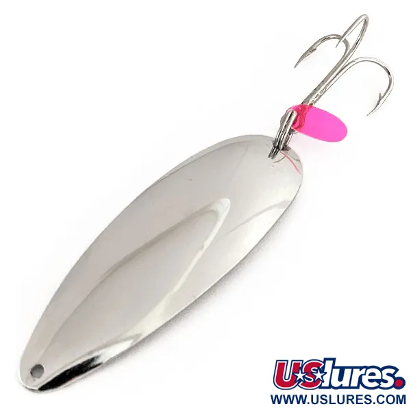 Il peso classico di 1/2 oz (14 g) rende questo esemplare una scelta versatile per lo spinning o la traina leggera a varie profondità. La finitura in nichel lucido offre un bagliore ad alto contrasto, caratteristica distintiva dei vecchi artificiali Johnson Sprite prodotti negli USA prima che la produzione venisse spostata all'estero. Identificata dal codice prodotto 11256, questa esca rappresenta un'era di artigianato nazionale che i collezionisti apprezzano per la qualità dei materiali. Il nome 'Johnson Sprite' è chiaramente stampato nel metallo sul retro, garantendo un marchio autentico per qualsiasi collezione di attrezzatura d'epoca. Un piccolo e vivace flap attrattore in plastica rossa è montato sull'anello spaccato insieme all'ancoretta, creando un punto focale visivo distinto rispetto al corpo argentato. Con una lunghezza di 2 3/4" (7 cm), il profilo a goccia dell'ondulante è progettato per prestazioni costanti. Questo articolo è in ottime condizioni, con una valutazione di 5/5 per la sua superficie lucida a specchio e la componentistica originale ben conservata.