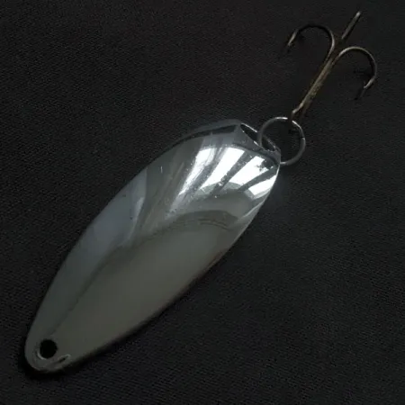 Punzonato chiaramente sul lato convesso del metallo lucidato, il nome "JOHNSON'S SPRITE" identifica questo classico ondulante di produzione americana. La finitura in nichel lucido offre un'elevata riflettività, specchiando la luce in modo efficace lungo tutto il corpo da 5 cm (2"). Con un peso di 10 g (1/3 oz), il profilo a forma di goccia è progettato per favorire la distanza di lancio e un recupero costante. Questo esemplare, con codice prodotto 22365, presenta un'ancoretta ben conservata fissata tramite un anellino spaccato circolare nella parte posteriore. Un singolo foro per la lenza è praticato sull'estremità anteriore affusolata per consentire il collegamento diretto o l'aggiunta di un moschettone. Le condizioni della superficie sono eccellenti, valutate 5/5, e mantengono una lucentezza brillante senza alcuna ossidazione visibile o perdita di placcatura. Prodotto negli USA, la solida struttura in metallo di questo Johnson Sprite rimane un riferimento per i pescatori che praticano il lancio tradizionale in acque dolci.