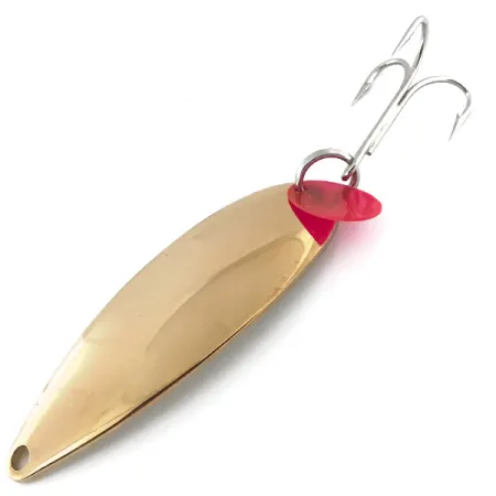 Stampigliato chiaramente sul retro del corpo lucido placcato in oro, il nome "Johnson Sprite" identifica un pezzo classico della storia dell'attrezzatura da pesca americana. Con un peso di 17 g (3/5 oz), questo cucchiaino ondulante da 10 cm (4") rappresenta la qualità originale del marchio prima che la produzione venisse spostata dagli USA alla Cina. La finitura dorata riflettente è abbinata a una caratteristica pinna attrattrice in plastica rossa sull'anello elastico, progettata per fornire un punto di attacco visivo vicino all'ancoretta affilata. Catalogato con il codice prodotto 8851, questo esemplare rimane in eccellenti condizioni, ottenendo un punteggio di 5/5 per la superficie pulita e la componentistica intatta. Per pescatori e collezionisti, la robusta struttura in metallo e l'affidabile montaggio dell'anello elastico distinguono questi modelli vintage dalle controparti moderne. Il profilo a goccia è adatto a varie tecniche di lancio e traina.
