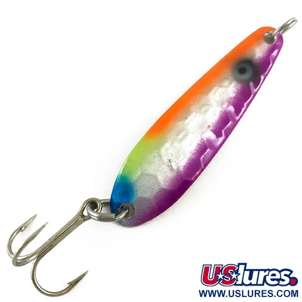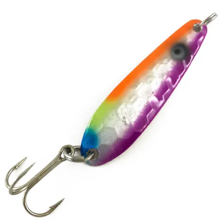 Il nome "JR STREAK" è chiaramente stampato sul retro in rame con texture a nido d'ape, identificando questo classico ondulante da traina. La faccia anteriore presenta un vivace motivo Rainbow Pearl, con una transizione da una punta arancione brillante attraverso il viola e il lime in una base blu profondo, il tutto su un centro bianco-argento testurizzato con un prominente punto oculare scuro. Questo esemplare, con codice prodotto 4373, misura 5,5 cm (2 1/4") e mette in mostra la qualità artigianale che ci si aspetta da un'esca Stinger prodotta negli USA. Il lato posteriore nei toni del rame fornisce un contrasto luminoso distintivo rispetto al fronte multicolore. La componentistica consiste in una robusta ancoretta e due anellini spaccati per un attacco sicuro. Le condizioni generali sono pari al nuovo (5/5).