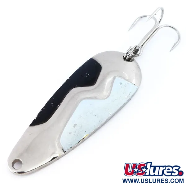 Sul retro del corpo in nichel lucidato sono impressi i marchi "JUMBO" e "KAMLOOPER", che identificano la stirpe di questo classico ondulante. Con un peso di 18 g (2/3 oz), quest'esca prodotta da Acme offre la densità necessaria per lanci a lunga distanza o per raggiungere profondità elevate. La parte anteriore della lama metallica da 6 cm (2 1/4") mostra una sorprendente finitura Nero / Bianco / Nickel, con i colori separati da una netta linea di confine a zigzag. Identificato dal codice prodotto 10807, questo esemplare prodotto negli USA è ben conservato, con una valutazione di 4/5 per le superfici pulite e la componentistica metallica intatta. Un amo triplo argentato è collegato alla coda tramite un robusto anello spaccato, mentre un foro sulla testa facilita il montaggio.