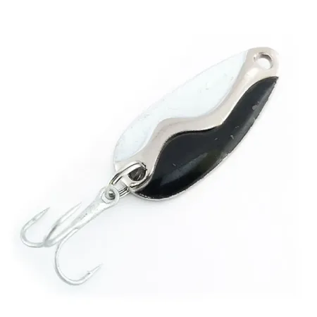Con un peso versatile di 7 g (1/4 oz), questo cucchiaino di fabbricazione americana presenta una sorprendente disposizione tricolore sulla faccia convessa. La finitura è suddivisa tra smalto nero e bianco pieno, separati da una linea ondulata in nichel lucidato distintamente curva che corre lungo tutta la lunghezza del corpo. Lungo 3,5 cm (1 1/2"), questa creazione Acme, identificata dal codice prodotto 9801, reca il nome del produttore e il timbro del modello chiaramente sul retro. Il pattern Nero / Bianco / Nickel ad alto contrasto fornisce un flash visivo significativo durante il lancio o la traina. Per quanto riguarda la componentistica, è dotato di un robusto anello spaccato e di un'ancoretta pulita e affilata. Questo esemplare è in ottime condizioni, con una valutazione di 5/5, con la vernice e la nichelatura che mantengono la loro lucentezza originale. Prodotto negli USA, la lavorazione evidenzia la robusta metallurgia e la finitura di qualità caratteristica dell'attrezzatura vintage Acme.