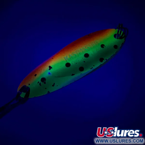 Abbastanza pesante per lanci a lunga distanza con i suoi 3/4 oz (21 g), il caratteristico taglio obliquo di questo ondulante metallico Acme offre un profilo su cui i pescatori contano da generazioni. Questo specifico esemplare, con codice prodotto 6054, misura 2 1/2" (6,2 cm) e presenta una livrea Trota Iridea splendidamente conservata. La transizione cromatica sfuma da un bordo arancione brillante a un giallo solare e termina con un verde vibrante, completato da punti neri posizionati con precisione. Sul retro, la finitura al nichel ad alta riflettività rimane pulita e brillante. Sulla superficie metallica sono impresse le parole "KASTMASTER ACME TACKLE CO.", che ne identificano l'origine USA e l'eredità tecnica. L'integrità strutturale è eccezionale, con una valutazione dello stato di 5/5, mostrando anelli spaccati ben mantenuti e un'ancoretta affilata. La sua struttura in lega bilanciata è specificamente progettata per la stabilità quando viene utilizzata a jig o recuperata in correnti forti.