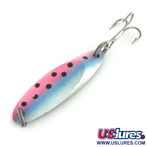Il rivestimento in nickel fornisce una base ad alta riflettenza per la colorazione Trota di questo ondulante da 7 g (1/4 oz). Prodotto negli USA con il codice 9340, il design originale Acme si affida a una specifica lega metallica che assicura un assetto perfetto durante il recupero o la caduta. Il pattern Trota mostra vivaci sfumature rosa e blu lungo il bordo superiore, punteggiate da macchie nere che imitano un piccolo pesce esca. Lungo 4,5 cm (1 3/4 pollici), questo artificiale è una scelta versatile per insidiare predatori in acque profonde o correnti sostenute dove è necessario un profilo denso e aerodinamico. La verniciatura e la finitura metallica sono in condizioni eccellenti, con una valutazione di 5/5. L'armamento è completato da un robusto amo triplo fissato tramite anellini spaccati rinforzati ad entrambe le estremità.