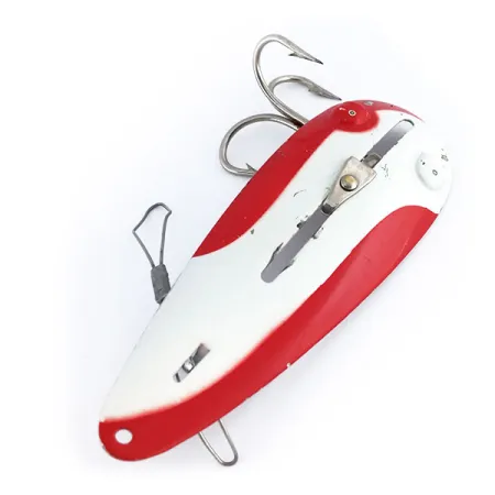 Una vivace livrea rossa e bianca copre la superficie superiore di questo ondulante Katch King da 25g (1oz), risalente al 1958. Prodotto negli USA con il codice prodotto 9948, il corpo da 9cm (3 1/2") presenta una parte inferiore in nichel lucidato. Questo esemplare si distingue per la sua costruzione convertibile; il meccanismo scorrevole superiore permette al pescatore di azionare un dispositivo antialga, adattando l'esca per il lancio tra la vegetazione o in acque libere. La finitura è mantenuta eccezionalmente bene, con una valutazione di 5/5 per i colori vivaci e le superfici metalliche pulite. La dotazione include un'ancoretta posteriore e un sistema antialga interno integrato nel telaio concavo.