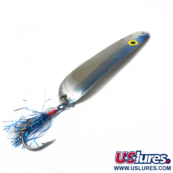 Le finiture in nichel e blu definiscono il profilo sottile di questo ondulante da traina prodotto negli USA, dal peso di 1/8oz (3,7g). Lungo 3 1/4" (8cm), il Kausch 14 è costruito su un corpo metallico slanciato progettato per tecniche di traina in acque profonde. La superficie superiore presenta una vivace striscia blu accanto al nichel riflettente, accentuata da un occhio dipinto in giallo e nero vicino al punto di attacco. Per un maggiore richiamo visivo, l'amo singolo è guarnito con fibre di tinsel blu e argento fissate da una piccola legatura rossa. Girando l'esca, si trova il codice prodotto 0441 riportato sul lato inferiore pulito e non verniciato. Con una valutazione delle condizioni di 4/5, la superficie metallica mantiene la sua lucentezza originale con solo lievi segni di manipolazione. Robusti anellini spaccati sono utilizzati su entrambe le estremità per garantire che l'amo piumato e l'attacco della lenza rimangano sicuri durante l'azione di pesca.