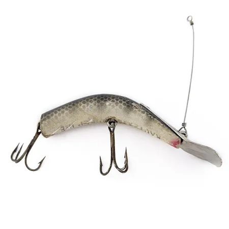 Un peso di 1/4 oz (7 g) conferisce a questa esca galleggiante in legno la densità necessaria per lanci precisi, mantenendo al contempo la galleggiabilità tipica del suo materiale. Con una lunghezza di 2 1/4" (6 cm), il corpo presenta una livrea a scaglie grigie e nere applicata meticolosamente che sfuma in un ventre più chiaro, dove il marchio "Kautzky Deep Ike" rimane ben leggibile. Questo modello specifico, codice prodotto 22633, è dotato di una vistosa paletta affondante in metallo e di un cavetto in acciaio originale, il che suggerisce il suo utilizzo per presentazioni in acque profonde. La finitura mostra lievi segni del tempo, risultando in una valutazione delle condizioni di 4/5 che ne sottolinea l'ottimo stato di conservazione e l'aspetto autentico. Due ancorette affilate sono fissate saldamente al corpo in legno con la minuteria originale. Un tocco di vernice rossa vicino alla gola offre un classico richiamo visivo che contrasta con i toni argento metallizzato e grigio del corpo principale.