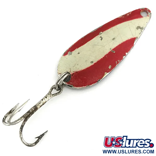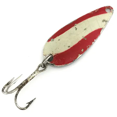 Strisce diagonali rosse e bianche definiscono il lato frontale di questo ondulante Keystone, un segno distintivo del design degli artificiali statunitensi della metà del secolo. Con un peso di 3/16oz (5,5 g), il corpo in metallo misura 1 3/4" (4,5 cm) e presenta una tradizionale forma a goccia ideale per il lancio. Questo esemplare, registrato con il codice prodotto 6934, ha una valutazione di condizione 3/5; la superficie verniciata mostra segni di usura dovuti all'età e piccole scheggiature che testimoniano la sua storia in pesca. Il lato posteriore è caratterizzato da una nichelatura che ha ammorbidito la sua lucentezza nel corso degli anni. Una singola ancoretta è fissata alla coda tramite un robusto anellino spaccato, mentre la testa presenta un occhiello pulito per il finale o un moschettone. Nonostante il produttore sia sconosciuto, la fattura riflette la qualità semplice e durevole tipica dell'attrezzatura americana d'epoca.