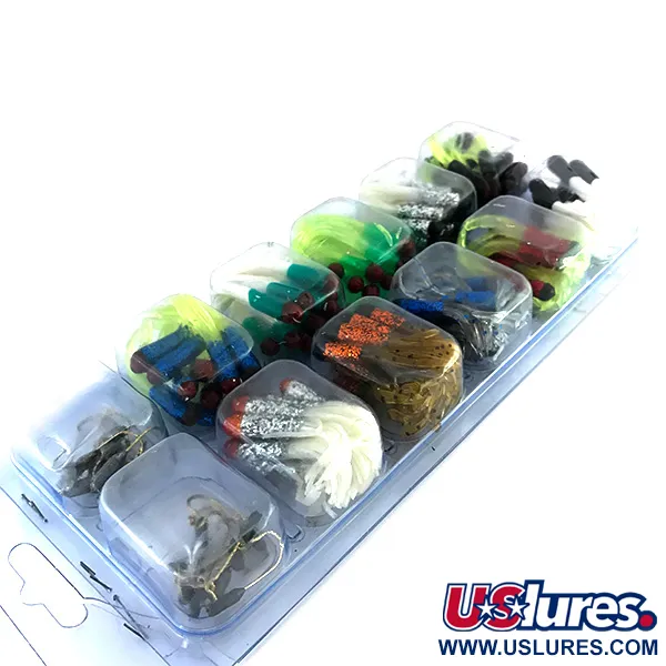 Diviso in dieci scomparti distinti, questo contenitore sigillato in fabbrica racchiude una selezione completa di esche morbide da 2" (5 cm) con gonnellino stile octopus. L'assortimento presenta una tavolozza di colori diversificata che include varianti Blu, Rosso, Giallo, Verde, Argento, Oro, Nero e Marrone. Cinque celle specifiche contengono esche UV-reattive, progettate per aumentare la visibilità in condizioni di scarsa illuminazione o in acque profonde. Prodotto negli USA da Creme, il kit è configurato specificamente per il jigging. Ogni scomparto contiene 10 singoli Maxi Tails, per un totale di 100 esche insieme a 19 testine piombate assortite situate nelle sezioni superiori del vassoio. Identificato dal codice prodotto 8368, il set presenta sia colori solidi ad alto contrasto che opzioni con glitter fini per un ulteriore richiamo visivo. Come articolo inutilizzato nella sua confezione originale, l'esemplare riceve una valutazione di 6.