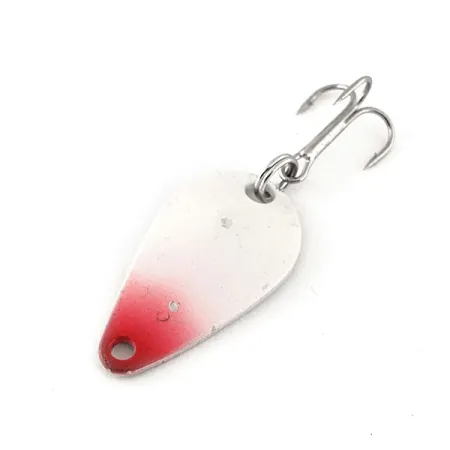 Una finitura White Pearl con una punta rossa vibrante distingue questo esemplare, una combinazione di colori classica per insidiare predatori attivi. Sul retro nichelato è chiaramente stampigliato il nome K.O. WOBBLER, a indicare la provenienza dalla Acme Tackle Company negli USA. Questo ondulante da 1/8oz (3,5g) misura esattamente 1 1/2" (3,5cm) di lunghezza ed è catalogato con il codice prodotto 12260. Progettato per lo spinning, l'azione dell'esca è pensata per imitare il nuoto di un piccolo pesce foraggio, producendo vibrazioni sonore distinthe durante il recupero. La componentistica prevede un robusto amo triplo fissato tramite un anello spaccato, con lievissimi segni di precedente utilizzo. Le condizioni sono 4/5, poiché l'ondulante mantiene la lucentezza originale e l'integrità della vernice. Un foro all'estremità stretta permette l'attacco diretto del filo o l'aggiunta di un moschettone a questa esca da lancio a forma di goccia.