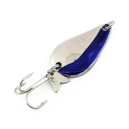 Stampato profondamente nella parte inferiore cromata, il nome "K.O. WOBBLER" identifica questo ondulante da 3,5 cm (1 1/2") come un classico della produzione americana di Acme. Il lato convesso mostra una netta divisione tra una base argento lucido e una striscia blu metallizzato profondo, una combinazione di colori studiata per un'alta visibilità. Con un peso di 7 g (1/4 oz), il corpo in metallo spesso garantisce la densità necessaria per lanci a lunga distanza e recuperi in profondità. Una caratteristica distintiva del codice 9764 è l'aggiunta di una piccola pinna metallica fissata all'anellino posteriore insieme all'ancoretta, che fornisce riflessi secondari e vibrazioni sonore meccaniche durante l'azione di pesca. Lo stato di conservazione è valutato 5/5, con una finitura estremamente pulita su tutte le superfici. Ogni componente rispecchia gli elevati standard qualitativi mantenuti da Acme nei suoi stabilimenti negli Stati Uniti.