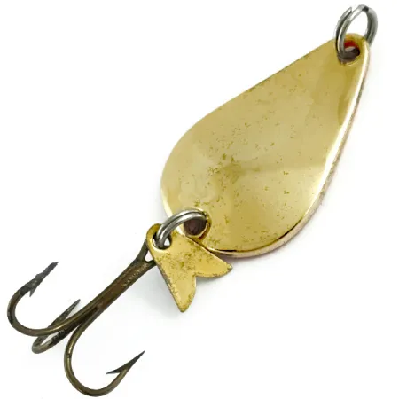 Una placcatura in oro lucido riveste il lato frontale di questo ondulante di produzione americana, garantendo riflessi ad alta visibilità anche in acque torbide. L'Acme K.O. Wobbler UV, identificato dal codice prodotto 5758, è un'esca da lancio compatta dal peso di 7 g (1/4 oz) e una lunghezza di 3,5 cm (1 1/2"). Una caratteristica distintiva di questo modello è la piccola coda metallica "Sonic flipper tail" collegata all'anello spaccato posteriore, progettata per produrre un movimento laterale durante il recupero. Mentre il fronte è dorato, il retro presenta una vivace finitura arancione fluorescente che reagisce intensamente alla luce ultravioletta, come mostrato nella fotografia UV dedicata. L'esemplare è in condizioni eccellenti, valutato 5/5, con la superficie placcata che mantiene un riflesso pulito e la minuteria priva di segni del tempo. Questa esca prodotta negli USA utilizza un robusto amo triplo e anelli spaccati rinforzati per garantire la massima durata nel tempo insidiando vari predatori.