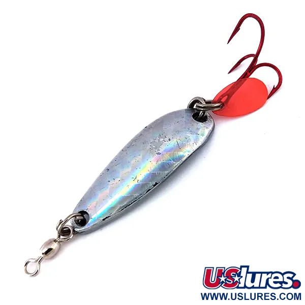 Un vivace motivo a scaglie prismatiche copre la superficie di questo ondulante da 9 g (1/3 oz), catturando la luce con un riflesso arcobaleno. Lungo 4 cm (1 1/2"), questo Luhr Jensen Krocodile è un elemento essenziale per i pescatori che insidiano trote o piccoli salmoni. Questo esemplare, identificato dal codice prodotto 10609, monta un'ancoretta rossa originale e la tipica paletta rossa in plastica sull'anello spaccato posteriore. Il corpo in metallo pesante fornisce la densità necessaria per lanci a lunga distanza da moli o barche. Le condizioni sono 5/5, con una finitura brillante e minuteria perfetta. Una girella barrel è pre-montata sull'anello di testa per gestire la torsione della lenza. Il metallo argentato della base emerge lungo i bordi, evidenziando il profilo stretto a goccia caratteristico di questo modello vintage Luhr Jensen.