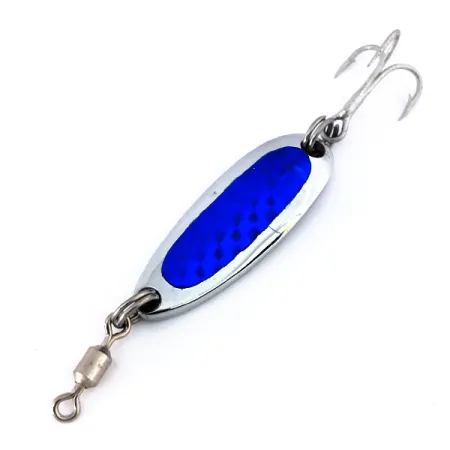 Un nastro prismatico di un blu profondo e vibrante copre il centro di questo cucchiaino ondulante da 3,5 cm (1 1/2"), catturando la luce con una caratteristica trama a scaglie. Con un peso di 7 g (1/4 oz), questo Luhr Jensen Krocodile è un elemento essenziale per chi cerca un'esca compatta capace di lanci a lunga distanza nonostante le dimensioni ridotte. Il lato posteriore presenta il classico marchio stampato, che identifica l'eredità Luhr Jensen e il nome del modello Krocodile. La componentistica di questo esemplare, identificato dal codice prodotto 15647, include una robusta girella a barilotto in testa e un'ancoretta affilata in coda, entrambe collegate tramite solidi anellini spaccati (split ring). Questa esca specifica non è stata utilizzata, mantenendo la sua lucentezza originale di fabbrica sulla finitura in nichel lucido. Il corpo stretto e stampato ad alto spessore è un segno distintivo della linea Krocodile, progettato per essere utilizzato efficacemente sia a spinning che a traina.