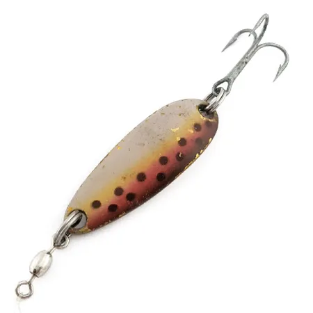 Punzonati chiaramente sul dorso in ottone lucido, i marchi 'LUHR JENSEN' e 'KROCODILE' identificano l'eredità di questo ondulante da casting da 1 1/2" (4 cm). Questo pezzo specifico, identificato dal codice prodotto 22434, presenta la dettagliata finitura Brown Trout, con una calda striscia laterale rosso-arancio e macchie scure su base metallica. Con un peso di 1/3oz (9g), è bilanciato per tecniche di lancio, traina o vertical jigging. La componentistica comprende una girella a barilotto sullo split ring anteriore e un'ancoretta affilata in coda, rendendolo pronto per l'acqua o per la vetrina. Per quanto riguarda la conservazione, le condizioni sono un rispettabile 4/5, con una finitura pulita che rispecchia la qualità della produzione statunitense. Questo design è molto stimato dai collezionisti per il suo profilo universale, capace di mantenere il movimento sia con un recupero lento che a velocità di traina sostenute.
