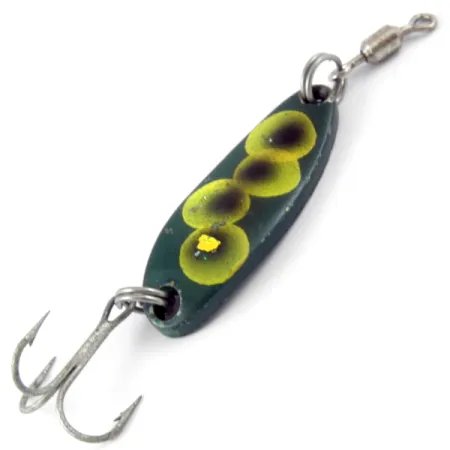 Una vernice verde foresta profondo fa da base ai quattro punti gialli e neri di questo classico Luhr Jensen. Lungo 3,5 cm (1 1/2") e pesante 7 g (1/4 oz), questo esemplare è il modello Krocodile, catalogato con il codice prodotto 3864. L'ondulante è caratterizzato da un corpo metallico spesso e stretto, progettato per lanci a lunga distanza e per raggiungere le sezioni più profonde della colonna d'acqua dove spesso stazionano i predatori. Sul retro sono stampate chiaramente le scritte "LUHR JENSEN KROCODILE" e "USA", a indicare l'origine autentica della produzione. È armato con anelli spaccati originali e un'ancoretta che mostrano una leggera usura, meritando una valutazione di 4/5. Una girella montata in testa è inclusa per ridurre la torsione della lenza durante il recupero. La livrea "Frog" offre un tipico aspetto screziato che imita le prede naturali in varie condizioni di luce. Sottili segni superficiali sulla finitura indicano la sua storia di esca usata ma ben conservata in cassetta.