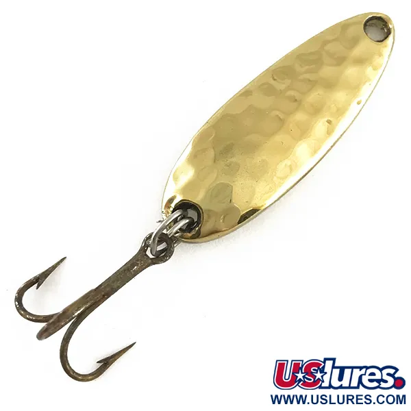 Le superfici in oro martellato conferiscono una trama distintiva a questo classico Luhr Jensen da 6 g (3/16 oz), progettato per catturare la luce da più angolazioni anche in acque torbide. Lungo 3,5 cm (1 1/2 pollici), il Krocodile presenta un profilo denso e stretto che lo rende uno dei preferiti per raggiungere distanze significative nel lancio. Sul lato posteriore liscio, il marchio "LUHR JENSEN KROCODILE" è impresso in modo netto, identificando questo pezzo come un'esca vintage prodotta in Oregon. L'ondulante è armato con un anello spaccato di serie e un amo triplo bronzato, mostrando solo minimi segni del tempo, a supporto della sua valutazione di condizione 5/5. Identificato dal codice prodotto 4264, la struttura in ottone massiccio assicura che affondi rapidamente verso la zona target quando si insidiano trote o persici. Un singolo foro all'estremità affusolata consente un facile collegamento a moschettoni o terminali.