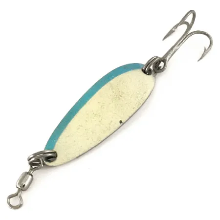 Con un peso di 9 g (1/3 oz), questo ondulante in metallo pesante è costruito per gestire le esigenze del lancio con vento forte o per raggiungere strutture in acque profonde. Il corpo da 4 cm (1 1/2") presenta una finitura bianco perla sul lato anteriore con una striscia blu lungo il bordo esterno, mentre il rovescio è rifinito in nichel lucido. Sul retro sono chiaramente stampati i marchi Luhr Jensen e Krocodile, corrispondenti al codice prodotto 7543. L'esemplare è conservato in condizioni 5/5, mantenendo il suo armamento originale che include robusti anellini spaccati, una girella a barilotto montata in testa e un'ancoretta. In base al design del produttore, questa esca è un vero ondulante che crea un movimento oscillante durante il recupero per imitare un pesce esca. Il rapporto peso/dimensioni specifico della serie Krocodile le permette di affondare più velocemente rispetto agli ondulanti più sottili, rendendola un elemento essenziale per i pescatori che insidiano trote o salmoni. Lo stampaggio netto e la brillante finitura metallica sul retro indicano che è stata conservata con cura.