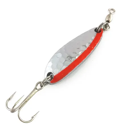 Con una lunghezza di 1 1/2 pollici (4 cm), questo classico ondulante presenta una distintiva finitura in nichel martellato sul lato convesso. Una vivace striscia rossa corre lungo un bordo della superficie martellata, fornendo un netto contrasto visivo con la lucentezza metallica testurizzata. Il lato posteriore è liscio e lucidato, chiaramente punzonato con il marchio "LUHR JENSEN KROCODILE", che lo identifica come un autentico articolo da pesca di produzione americana. Con un peso di 1/3 oz (9 g), il suo profilo spesso è progettato per lanci a lunga distanza e per raggiungere gli strati più profondi della colonna d'acqua. La componentistica include un robusto amo triplo e una girella collegati tramite anellini spaccati, entrambi con le superfici pulite e riflettenti tipiche di un'esca in condizioni pari al nuovo. Essendo un esemplare mai usato, non presenta segni di usura da cassetta degli attrezzi. Questo modello specifico, catalogato con il codice prodotto 7869, rappresenta la versatilità per cui Luhr Jensen è nota sia nello spinning che nella traina.