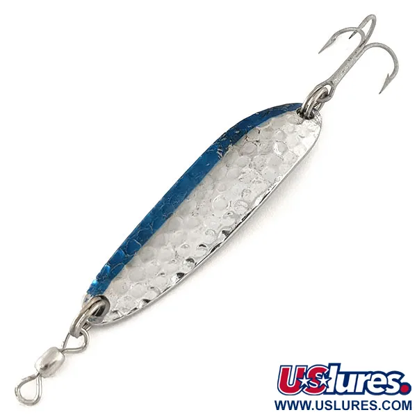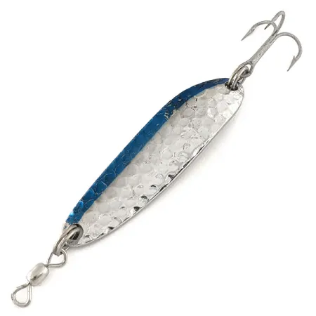 Sul retro è chiaramente impresso il marchio "Krocodile DIE #3", che identifica l'origine di Luhr Jensen da Hood River, Oregon. Con un peso di 10 g (1/3 oz), questo ondulante presenta una distinta finitura in nichel martellato che cattura la luce sulla sua superficie strutturata. Una vivace striscia blu corre lungo un bordo del corpo da 5,5 cm (2 1/4"), offrendo un netto contrasto con il metallo lucido. Questo specifico esemplare, con codice prodotto 12253, è in condizioni eccellenti, valutato 5/5. La componentistica è robusta, con una girella barrel fissata tramite un anello spaccato in testa e un'ancoretta affilata in coda. Il suo profilo stretto e leggermente curvo è un segno distintivo del design Krocodile, utilizzato principalmente per le tecniche di spinning e traina. La maestria artigianale di questo modello Die #3 riflette l'epoca in cui queste esche divennero un punto fermo per le specie sia d'acqua dolce che salata. La lucentezza simile al cromo rimane brillante tra le rientranze della martellatura, evidenziando la superficie strutturata.