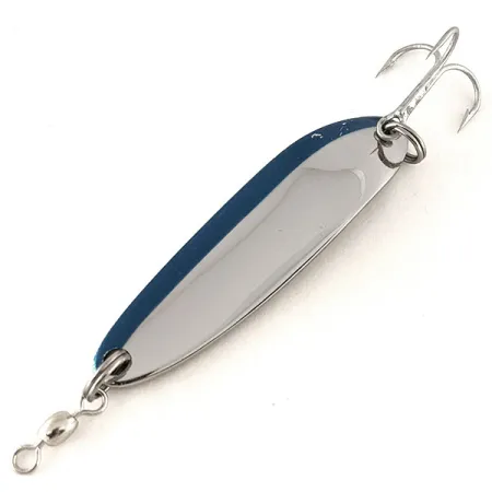 Il marchio 'KROCODILE DIE #3', impresso in profondità nella superficie concava in nichel, identifica questo classico cucchiaino ondulante di Luhr Jensen. Con una lunghezza esatta di 5,5 cm (2 1/4") e un peso di 10 g (1/3 oz), questa esca presenta una distintiva finitura Nichel / Blu dove una superficie metallica lucida è accentuata da una striscia blu profondo lungo un bordo. Questo specifico esemplare, identificato dal codice prodotto 12435, è inutilizzato e mantiene la sua lucentezza originale di fabbrica. La configurazione della minuteria è tradizionale per questo design nato a Hood River, Oregon, e utilizza una girella a barile fissata tramite un anello spaccato in testa e un'ancoretta affilata in coda. Il suo corpo stretto e pesante è costruito per lanci a lunga distanza e una traina efficace. Il punteggio 5/5 indica un articolo ben conservato con tutti i dettagli del marchio e il luogo di produzione perfettamente leggibili.