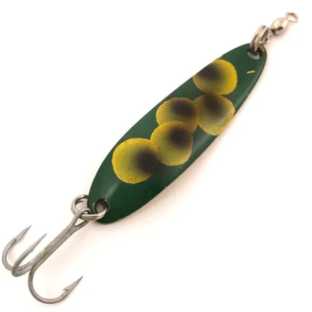 Rifinito con un distinto motivo Frog, questo ondulante da 1/3 oz (10 g) presenta audaci macchie gialle con centri scuri su uno sfondo verde foresta profondo. Lungo 2 1/4" (5,5 cm), questo esemplare porta il classico profilo Luhr-Jensen, costruito più stretto e spesso rispetto agli ondulanti standard per favorire il raggiungimento di maggiori distanze durante il lancio. Il retro del metallo color ottone è chiaramente stampato con "KROCODILE", "DIE #3" e "HOOD RIVER, ORE", a testimonianza della sua eredità manifatturiera americana. Questo articolo specifico, catalogato con il codice prodotto 3866, mostra leggeri e onesti segni di usura sul retro metallico, mentre la faccia verniciata rimane straordinariamente pulita e vibrante, meritando una valutazione di condizione 4/5. La dotazione include un robusto amo triplo fissato tramite un anellino spaccato e una girella superiore per aiutare a gestire la torsione del filo. Progettato per specie che vanno dal salmone dei Grandi Laghi alla trota di lago, il Krocodile è ampiamente riconosciuto per il suo movimento oscillante costante che imita efficacemente il pesce esca durante un recupero regolare.