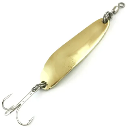 Stampati chiaramente nel metallo, i nomi Luhr Jensen e Krocodile risaltano sul retro di questo cucchiaino da 1/2 oz (14 g). Questo modello Die #3, catalogato con il codice 5781, presenta un profilo stretto a goccia lungo 5,5 cm (2 1/4"). La finitura in Oro lucido è eccezionalmente pulita su tutto il corpo, riflettendo la qualità costruttiva legata alla tradizione di Luhr Jensen nel Pacifico nord-occidentale. Per il montaggio, è dotato di una girella a barile sull'anello spaccato superiore e di un'ancora argentata in coda. Questo particolare esemplare è in condizioni 5/5, con una superficie lucida che rimane brillante e riflettente. L'alto spessore del metallo è stata una scelta progettuale deliberata del produttore per aiutare i pescatori a raggiungere strati d'acqua più profondi durante un recupero costante. Ogni dettaglio, dalla nitida marcatura del marchio all'integrità della minuteria, indica un reperto di storia della pesca ben conservato.