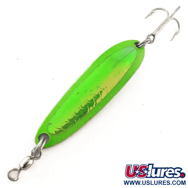Lungo 5,5 cm, il profilo stretto di questo Luhr Jensen Krocodile Die #3 UV è progettato per tagliare l'aria per lanci a lunga distanza in acque profonde. Questo ondulante da 10 g (1/3 oz) è rifinito in una vivace tonalità verde e presenta un nastro prismatico riflettente al centro per massimizzare il flash. Quando i livelli di luce calano, le proprietà luminescenti forniscono una sagoma luminosa, caratteristica fondamentale per insidiare salmoni o trote in acque profonde. Identificato dal codice prodotto 11967, l'esemplare è in condizioni 5/5, senza segni di usura sulle superfici verniciate o sulla componentistica originale. L'armamento è composto da un robusto anellino spaccato, un'ancoretta affilata e una girella di alta qualità in testa per ridurre la torsione del filo durante il recupero costante.