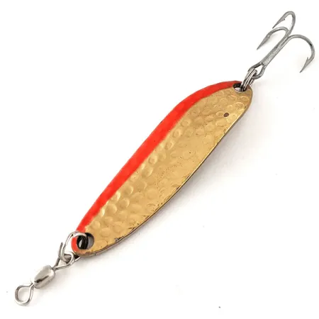 L'ottone martellato copre la maggior parte della superficie di questo ondulante da 5,5 cm (2 1/4"), fornendo una finitura strutturata che cattura la luce da più angolazioni. Una distintiva striscia rossa corre lungo un bordo, rivelando la sua vera natura in acque profonde o in condizioni di scarsa illuminazione come elemento UV-reattivo ad alta visibilità. Con un peso di 10 g (1/3 oz), il Luhr Jensen Krocodile Die #3 (Codice: 12325) è costruito con un metallo pesante per le sue dimensioni, rendendolo una scelta affidabile per lanci lunghi. La componentistica è in eccellente stato, con una robusta girella barrel in testa e un affilato amo triplo assicurato da un anello spaccato ad alta resistenza. Questo esemplare è in condizioni 5/5, pulito e ben conservato. Spesso preferito per il salmone o la trota, il design stretto e spesso del Krocodile è un punto fermo per i pescatori che devono raggiungere rapidamente la profondità. È progettato per un movimento oscillante costante durante il lancio, la traina o anche il vertical jigging, rappresentando la qualità che ci si aspetta dalla produzione USA di Luhr Jensen.