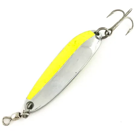 Una vernice fluorescente chartreuse copre esattamente metà di questo ondulante da 10 g (1/3 oz), fornendo un netto contrasto visivo rispetto alla nichelatura lucida. Lungo 5,5 cm (2 1/4"), questo Luhr Jensen Krocodile Die #3 (Codice prodotto 7483) presenta un corpo stretto e fustellato ad alto spessore, progettato per tagliare l'aria e raggiungere rapidamente la profondità. I pescatori che insidiano salmoni o trote si affidano spesso a questo specifico profilo per lanci a lunga distanza da moli o scogliere. Sotto la luce UV, la sezione chartreuse rivela la sua vera natura, virando verso una luminescenza verde brillante che rimane visibile in acque profonde o velate. La minuteria è puramente funzionale, con una girella barrel in testa per prevenire la torsione della lenza e un'ancoretta affilata assicurata da un robusto anello spaccato. Questo esemplare è in condizioni 5/5, mantenendo la sua lucentezza originale di fabbrica e transizioni di colore pulite senza alcun segno di usura. Il marchio Luhr Jensen stampato sul retro ne conferma l'origine, mettendo in mostra la finitura durevole che ha reso il Krocodile un classico nelle cassette da pesca per decenni.
