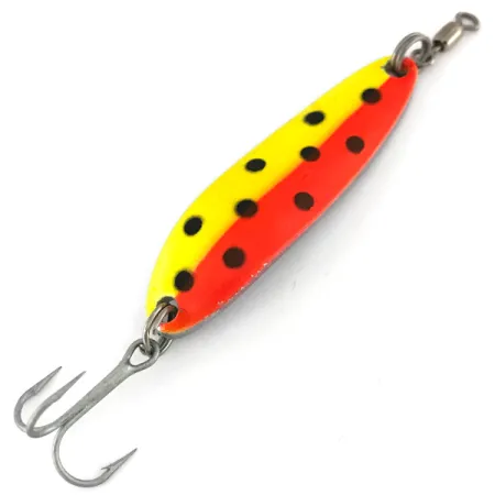 Diviso esattamente a metà, il lato frontale di questo ondulante Luhr Jensen presenta una combinazione sorprendente di giallo vibrante e rosso intenso. Con una lunghezza di 5,5 cm (2 1/4") e un peso di 14 g (1/2 oz), questo Krocodile Die #3 UV possiede lo spessore necessario per lanci a lunga distanza anche contro i forti venti dei Grandi Laghi. Identificato dal codice prodotto 7523, l'esemplare è costruito su una base nichelata che fornisce un bagliore metallico costante sotto il suo schema a macchie. Sotto la luce ultravioletta, la finitura fluorescente si trasforma in modo significativo: il lato giallo vira verso un verde neon brillante e il lato rosso assume una tonalità arancione incandescente, mentre i punti neri rimangono ben visibili. Questa costruzione pesante permette all'esca di raggiungere rapidamente la profondità quando si lancia dai moli o si pratica la traina al salmone. L'esemplare è in condizioni eccellenti, valutato 5/5, ed è equipaggiato con componentistica originale pulita, inclusa una girella montata in testa e un amo tripletta affilato e robusto. Questo modello è noto per mantenere un movimento oscillante costante sia con recuperi lenti che veloci.