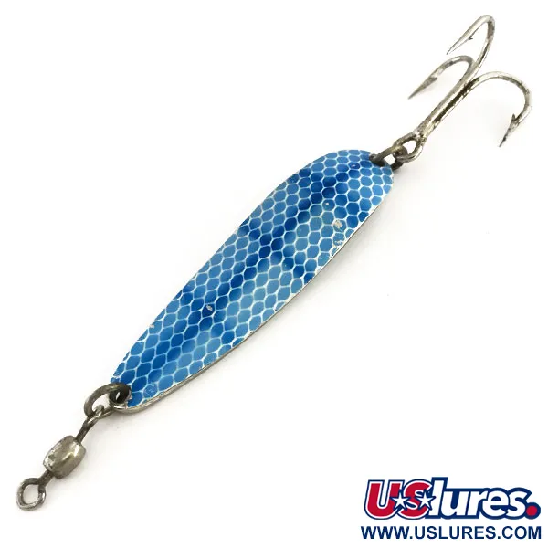 Un accattivante motivo a nido d'ape blu adorna il lato frontale di questo Luhr Jensen Krocodile Die #4, un design classico della loro produzione negli USA. Con un peso di 21g (3/4oz), questo ondulante da lancio da 6,5cm (2 1/2") è costruito per raggiungere distanza e profondità, spesso preferito dai pescatori che insidiano i salmoni in risalita nei Grandi Laghi. Il retro presenta una finitura in nichel lucidato, con il marchio Luhr Jensen stampato. Identificato dal codice prodotto 9138, l'esca esibisce un caratteristico movimento oscillante dovuto al suo profilo spesso e stretto. È equipaggiato con una robusta girella a barile in testa e un affilato amo triplo in coda. La finitura sia delle scaglie blu che del dorso in nichel è eccezionalmente ben conservata, con una valutazione dello stato di 5/5. Sia lanciato da un molo che trainato, la distribuzione del peso elevata consente presentazioni costanti in acque profonde.