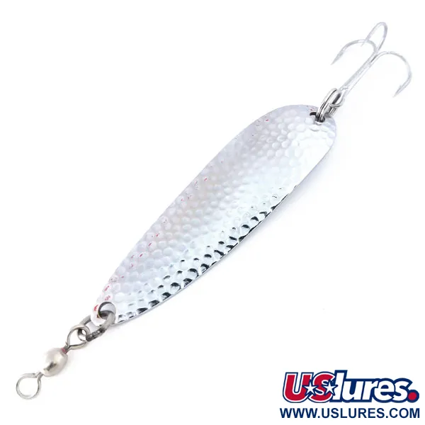 Lungo 3 1/4" (8,5 cm), il corpo ad alto spessore di questo ondulante è costruito appositamente per raggiungere acque profonde e massimizzare la distanza di lancio. La finitura in Nichel martellato sulla faccia convessa crea un riflesso strutturato per catturare la luce in varie condizioni, mentre il lato posteriore liscio presenta i marchi autentici Luhr Jensen e Krocodile di Hood River, Oregon. Con un peso di 1 oz (25 g), ha una massa sufficiente per mantenere la posizione nella colonna d'acqua anche in presenza di forti correnti o vento. Catalogato con il codice prodotto 10586, l'ondulante è in condizioni 5/5, con placcatura ben conservata e componentistica originale. Viene fornito armato con una robusta ancora e una girella barilotto integrata per gestire la torsione del filo durante il recupero.