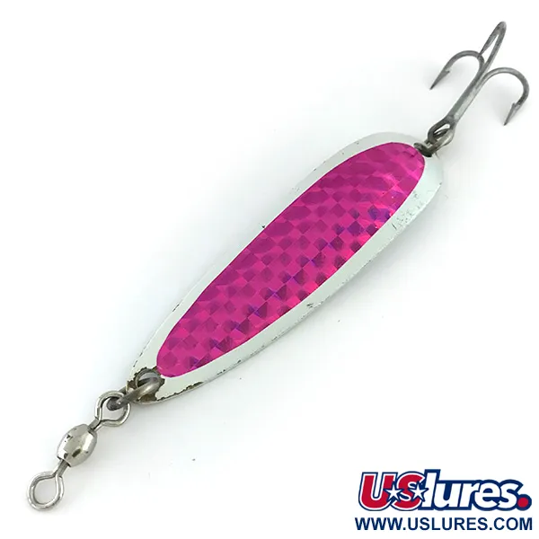 Con una lunghezza sostanziale di 3 1/4 pollici (8,5 cm), questo ondulante in metallo ad alta resistenza presenta un nastro prismatico rosa applicato su un corpo cromato riflettente. Questo Luhr Jensen Krocodile Die #5, identificato dal codice prodotto 8508, pesa 1 oz (25 g), una classe di peso specificamente progettata per aiutare i pescatori a raggiungere i pesci in profondità o a effettuare lanci a lunga distanza da moli e banchine. Il lato posteriore dell'ondulante è chiaramente stampato con i marchi storici del brand, "KROCODILE" e "LUHR JENSEN", insieme alla sua origine americana. Sia la girella barrel montata in testa che l'amo triplo posteriore sono fissati con robusti anelli spaccati, mantenendo l'integrità necessaria per le specie di salmonidi più grandi. Il motivo a prisma su questo esemplare fornisce un riflesso luminoso sfaccettato e multidirezionale che contrasta con il metallo lucido del perimetro dell'esca. Questa esca rimane in ottime condizioni, con un rating di 5/5. Le scritte stampate sul retro sono profonde e leggibili, un dettaglio che i collezionisti apprezzano in questi classici ondulanti da lancio.